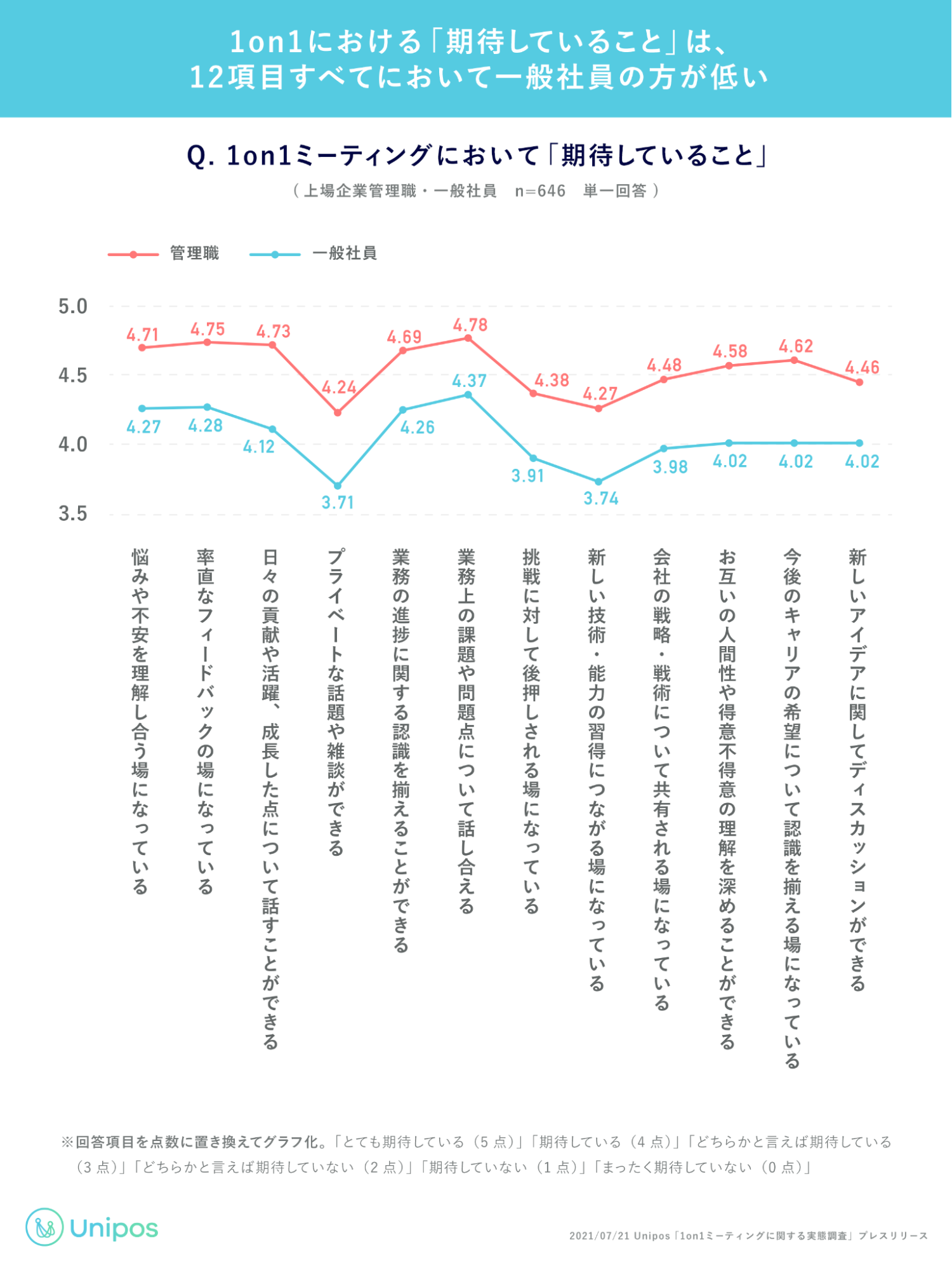 全国の上場企業に勤務する20代〜60代の管理職325人と、一般社員324人を対象に行われた「1on1ミーティングに関する実態調査」(※)によると、1on1ミーティングに期待する要素全てにおいて、上司より部下の期待値が低いことが分かりました。