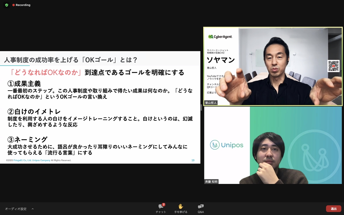 ・登壇:株式会社サイバーエージェント 常務執行役員CHO 曽山 哲人氏、Fringe81株式会社 執行役員 兼 Uniposカンパニー社長 斉藤知明