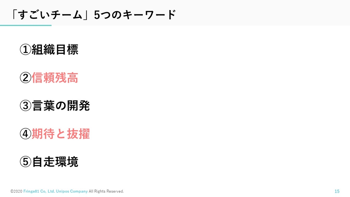 そんな曽山氏が挙げる「すごいチーム」を作るための5つのキーワードは以下の通りです。