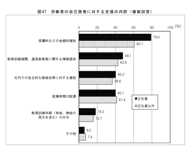 個人が自発的に行う仕事に役立つ学習のこと。個人の費用負担が大きいことから、学習資料や書籍、検定代の補助などで支援する企業が多い |