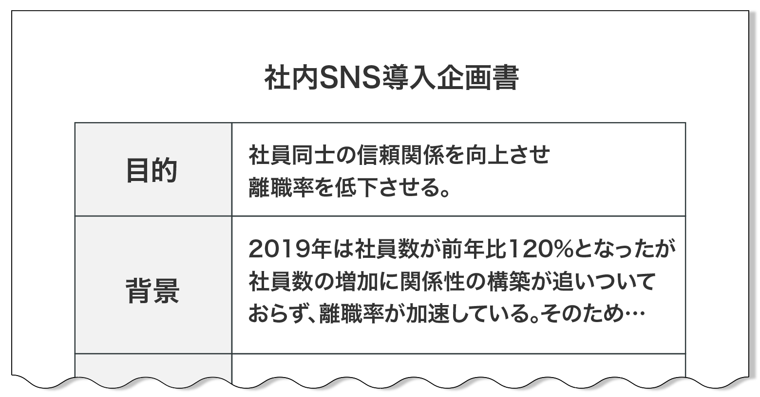 できれば「社内SNS導入企画書」といったドキュメントを作成し、目的・背景・達成したい具体的な指標などを明記しておくことをおすすめします。