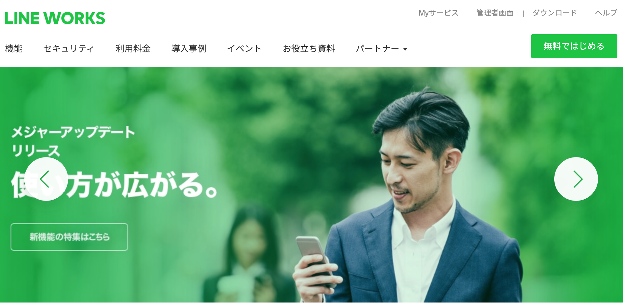 LINE WORKSは、LINE株式会社が展開する「ビジネス版LINE」です。LINEでおなじみのチャットやスタンプに加えて、掲示板・カレンダー・アドレス帳・アンケートなどの仕事で活用できる機能を備えています。