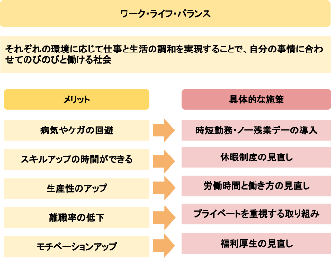 福利厚生やオフィス環境を見直すときには「ワーク・ライフ・バランス」を念頭に置いて考えるようにしましょう。