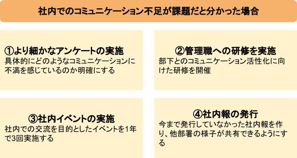 例えば、コミュニケーション不足が課題となっている場合は、上記のようにいくつもの視点から解決策を提案します。
