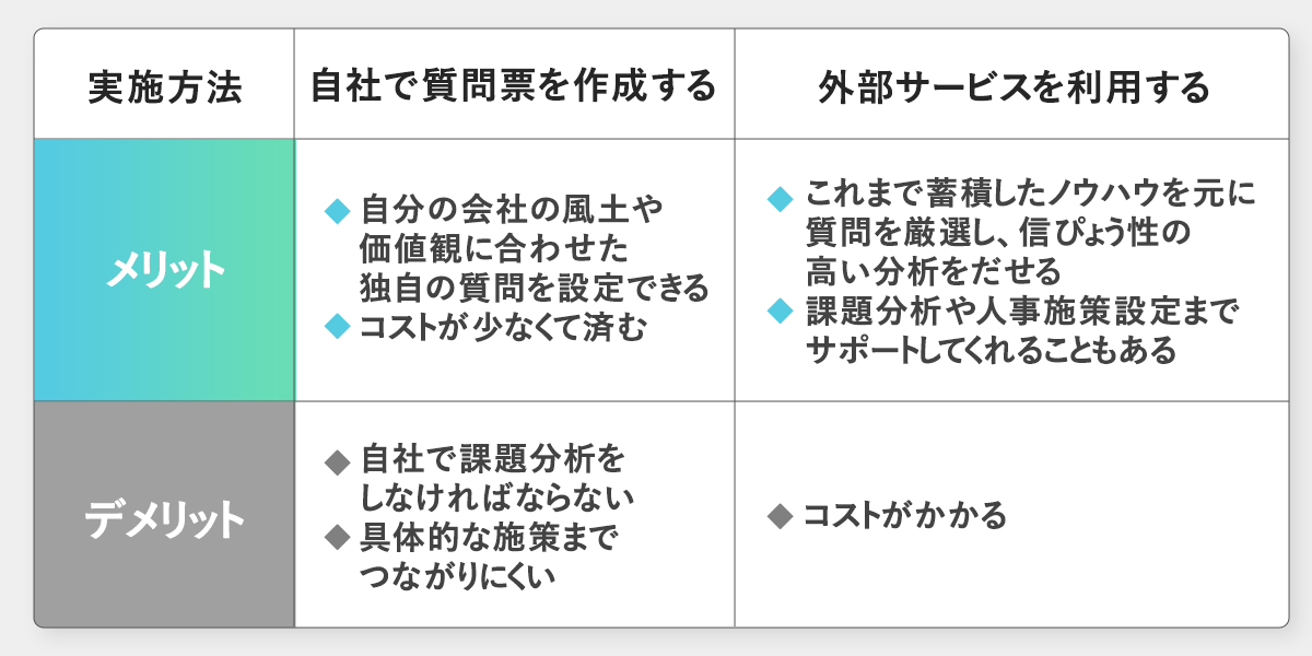 エンゲージメントサーベイ実施においては、自社で従業員が回答するための質問表を作成する方法と、質問設定から分析、場合によってはコンサルまでを外部サービスに委託する方法があります。