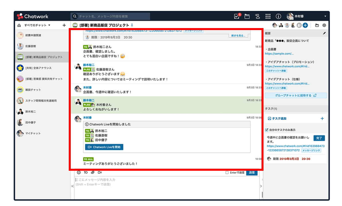 ⇒メッセージの投稿はリアルタイムにアップされ、時系列でタイムライン上に並んで表示されます。その時にオンライン中のメンバーならば、送られてきたメッセージをすぐに確認することができます ※画像はChatworkの公式ホームページより