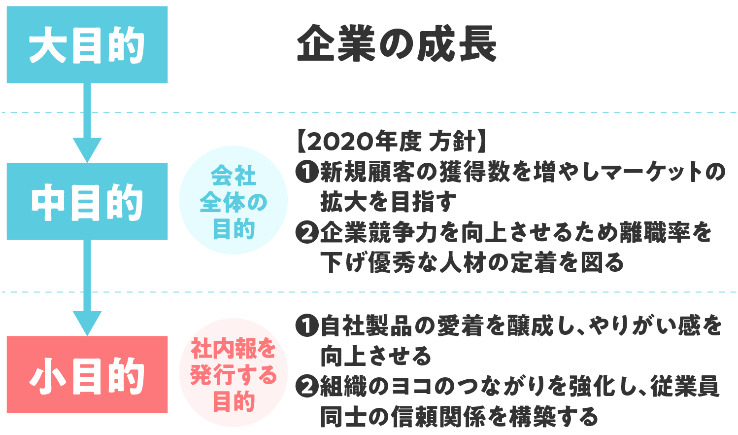 このように、大目的→中目的→小目的(=社内報の発行目的)と順序立てて考えることで、会社の成長に貢献する社内報を企画できるようになります。