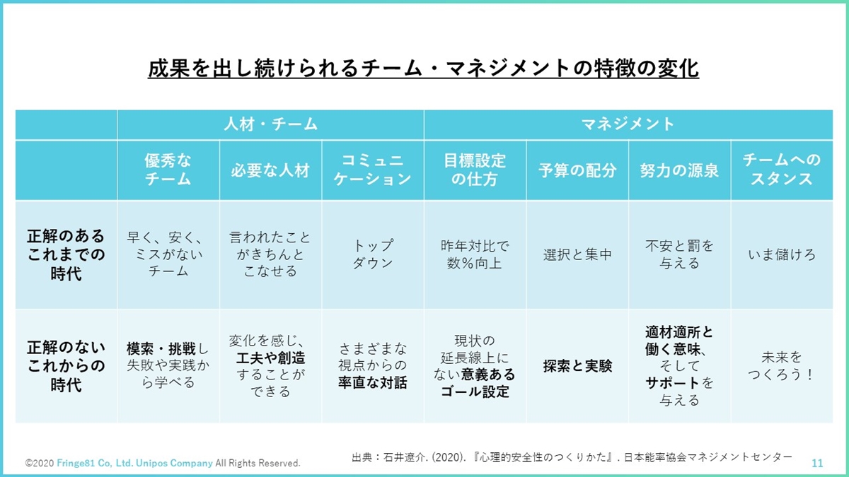 たとえば以前は「早く、安く、ミスがないチーム」が優秀なチームでしたが、正解のないこれからの時代は「模索・挑戦し、失敗や実践から学べるチーム」が優秀なチームとなります。
