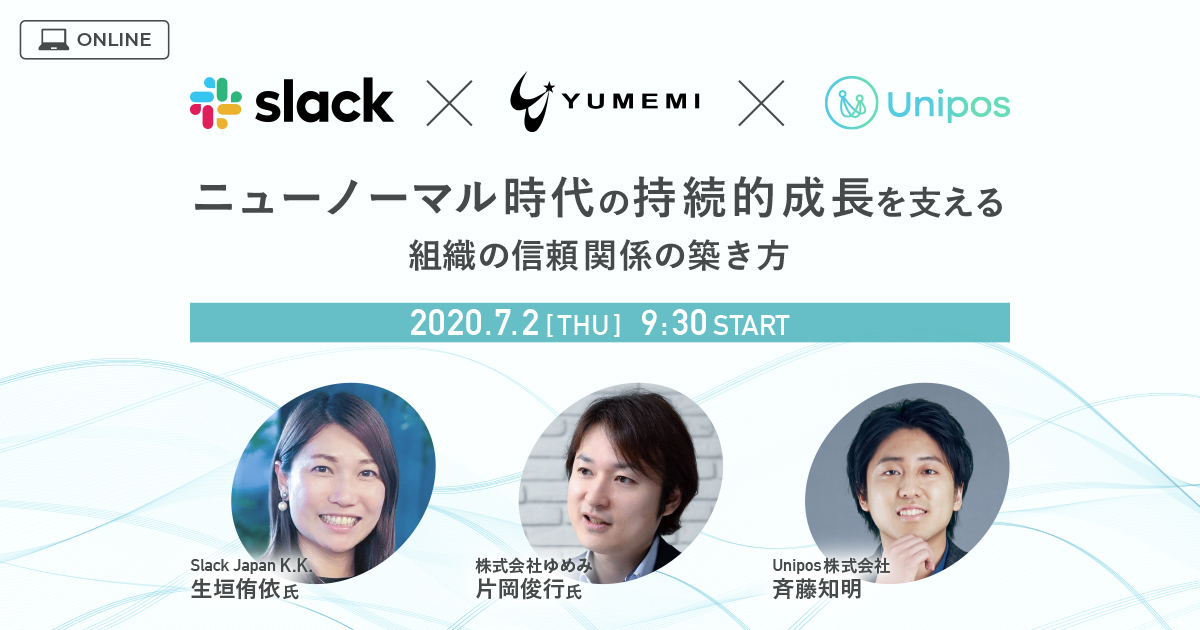 コロナ危機にいち早くテレワークに取り組み、大きな成果を上げているSlack Japan K.K. ビジネスグロース営業部部長 生垣侑依氏と、株式会社ゆめみ 代表取締役 片岡俊行氏が2020年7月2日開催のUniposウェビナー「ニューノーマル時代の持続的成長を支える組織の信頼関係の築き方」に登壇。Unipos株式会社 代表取締役社長 斉藤知明と共に、ニューノーマル時代の組織のあり方について話し合いました。
