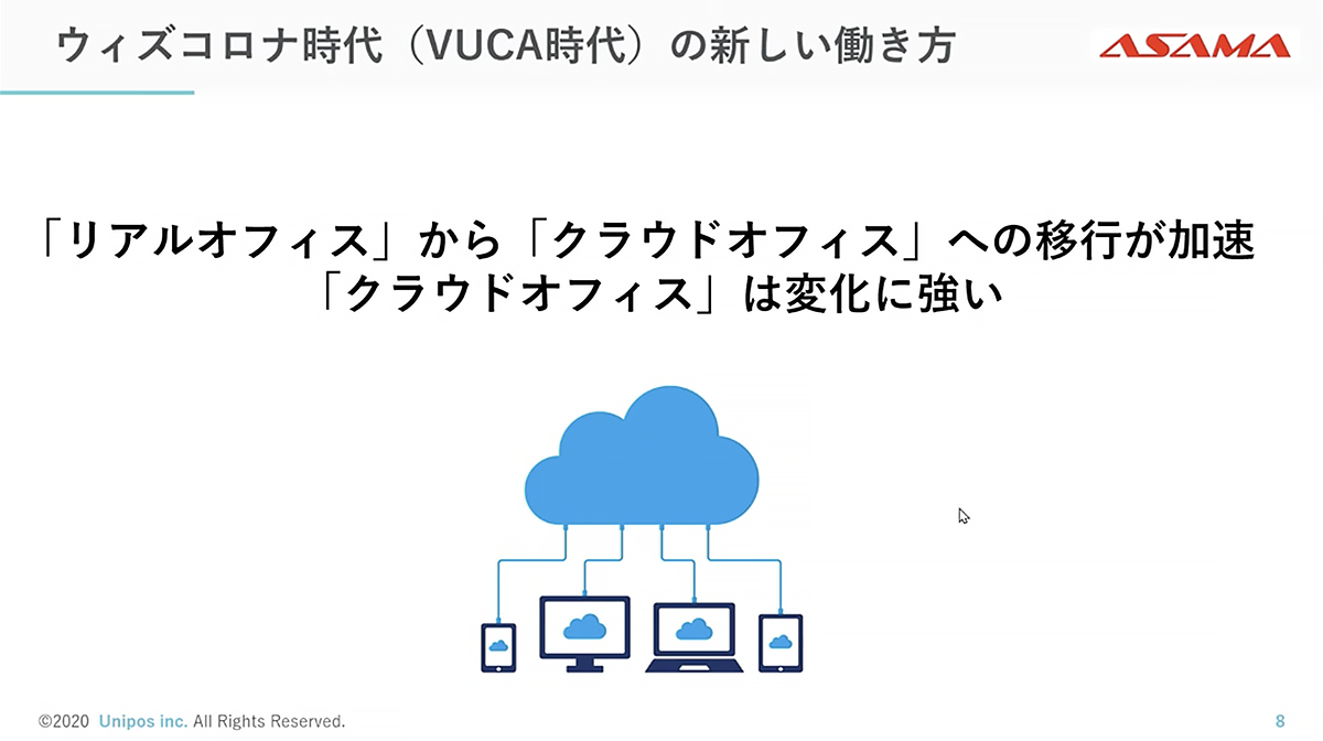 Withコロナ時代において柳沢氏が目指すのは「リアルオフィスからクラウドオフィスへの移行」だといいます。どこにいても働くことができるクラウドオフィスには多くのメリットがあり、これからのVUCA時代に最適なオフィスの形だと柳沢氏は考えているそうです。