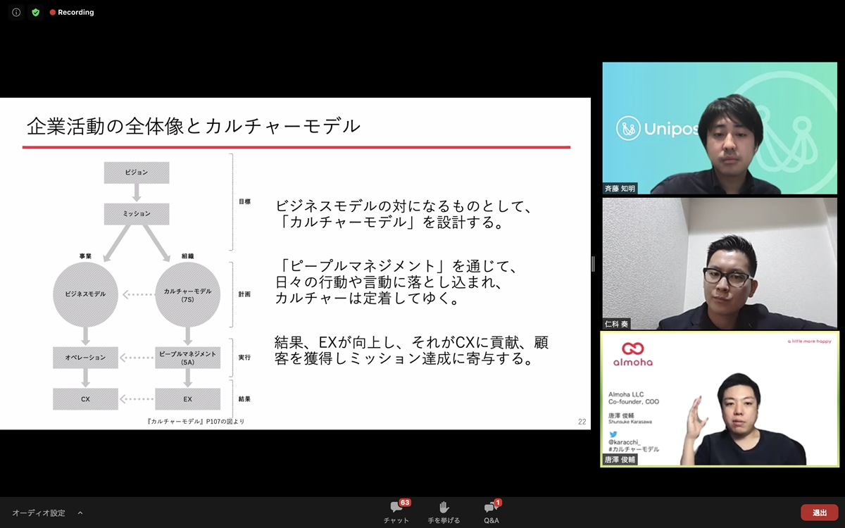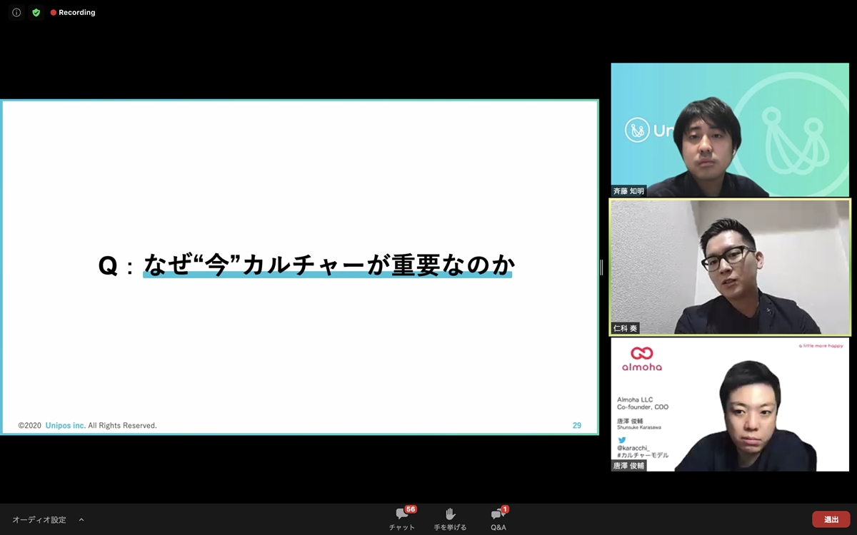 唐澤氏のお話をもとに、ウェビナー後半ではディスカッションを実施。より詳しくカルチャーの浸透について掘り下げました。