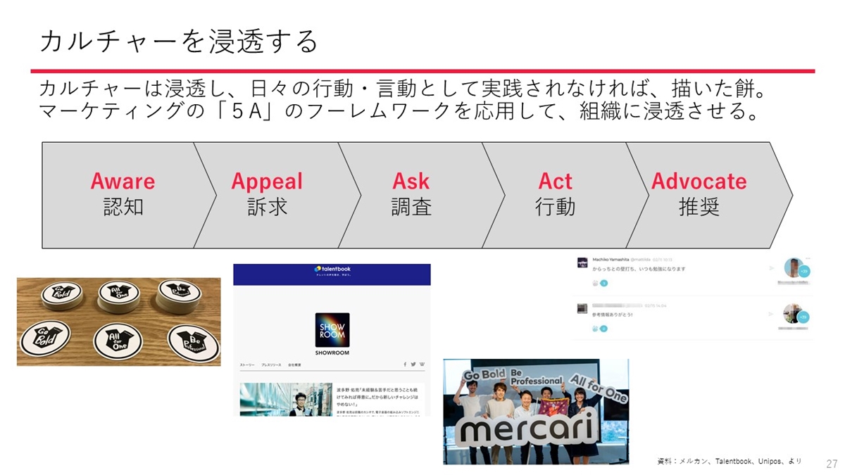 カルチャーを言語化したら、続いて組織への浸透を進めます。ここでは、マーケティングでよく用いられる「5A」というフレームを応用して考えると良いそうです。