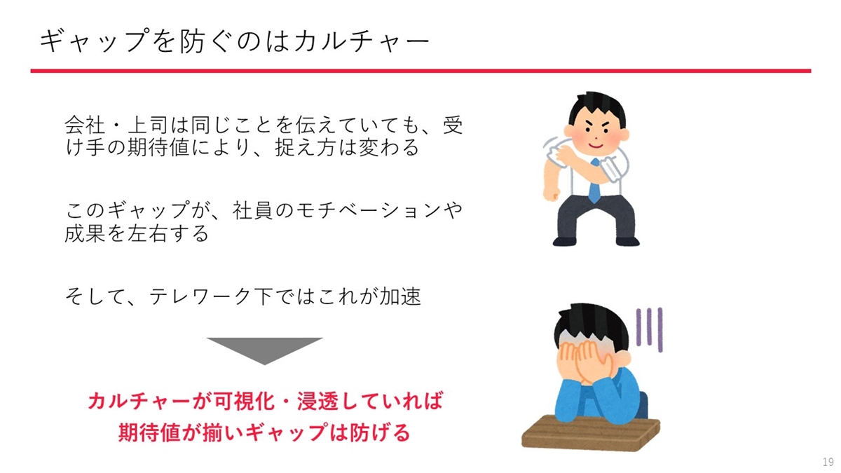 そのような事態を防ぐために有効なのが「カルチャー」です。カルチャーが浸透した組織はメンバーが強い結びつきを持ち、テレワーク下で起こりがちなコミュニケーションギャップを防止できるのです。