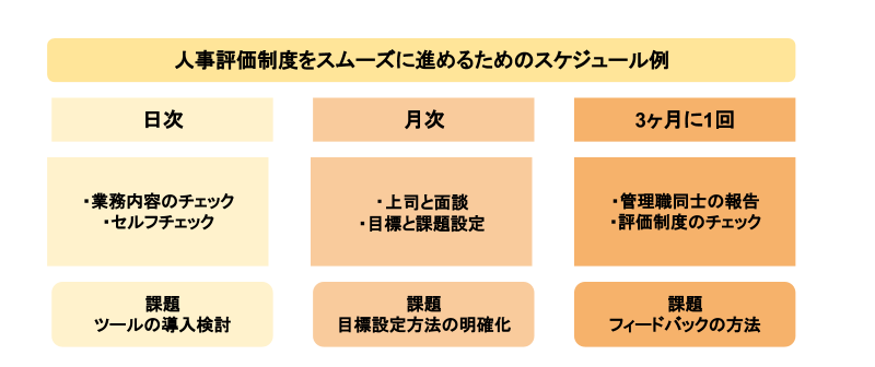 そこで、下記のようにどのようなスケジュール感で人事評価を進めるのか、一度明確にしてみることをおすすめします。