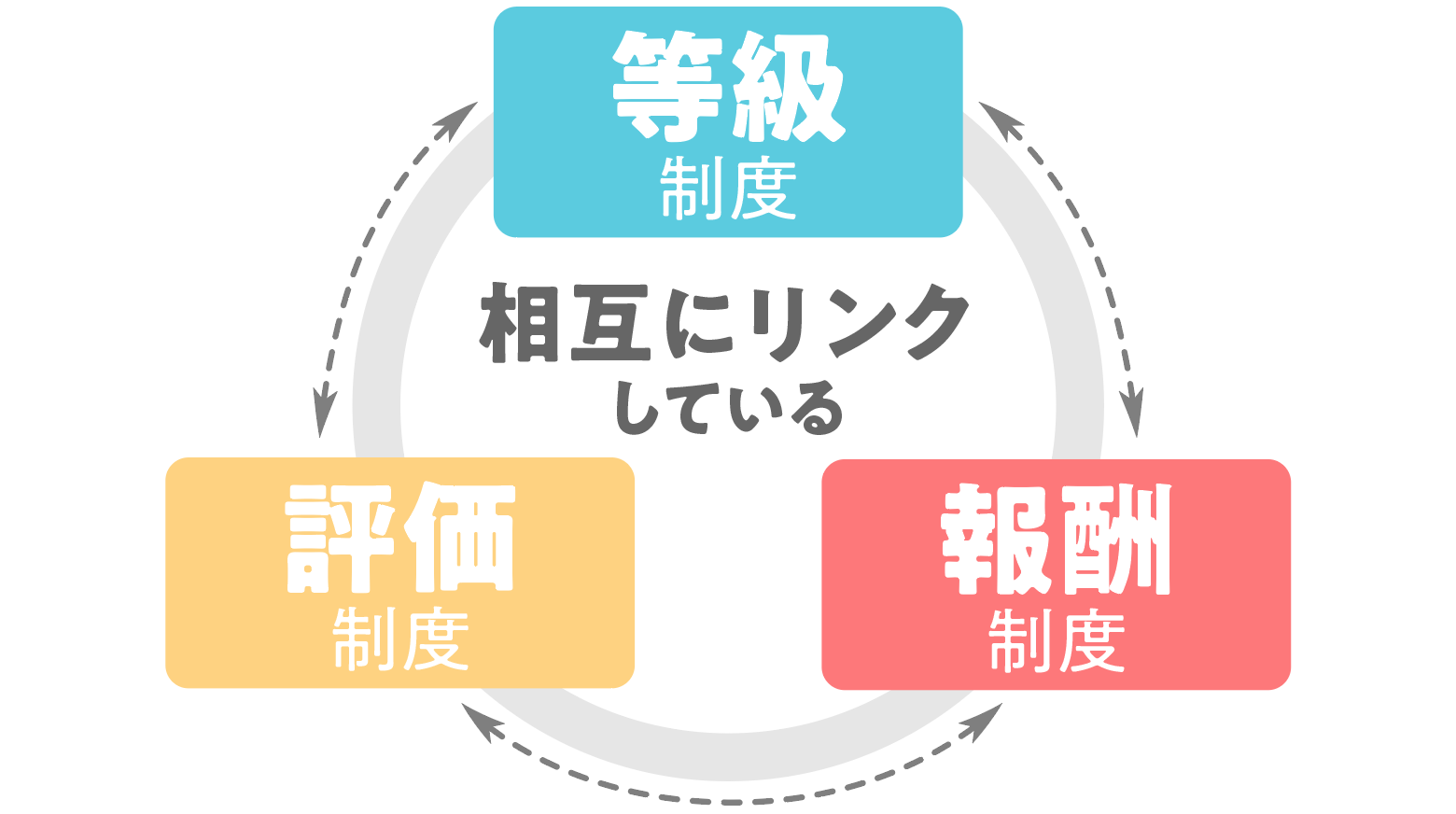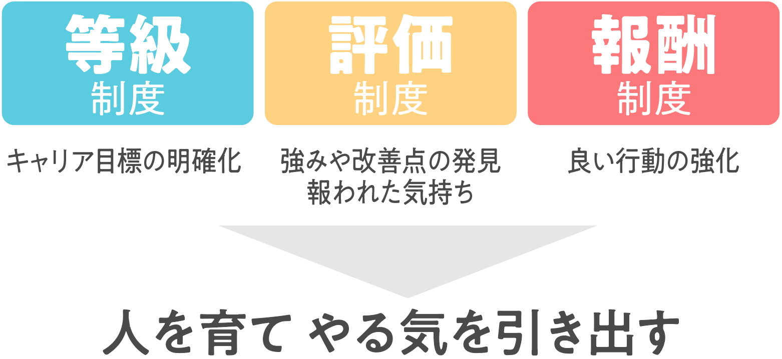 従業員の処遇を決定する仕組みは「①等級制度 ②評価制度 ③報酬制度」の3つの柱から成り立っています。