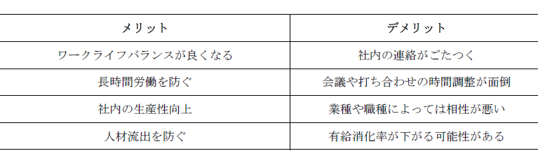 こんな人が使うとデメリットがある ● 社外の人と会うのが多い役職 取引先が同じ制度を利用していない場合は、旧制度の会社時間に合わせるしかない ●会議やプレゼンが多い部署 参加者の都合が調整できず、会議日程が決まらないこともある。顔を合わせる機会が減る ● 自己管理が出来ない人 仕事が遅い、段取りが悪い人の場合、仕事の進捗が悪くて迷惑かける可能性がある |