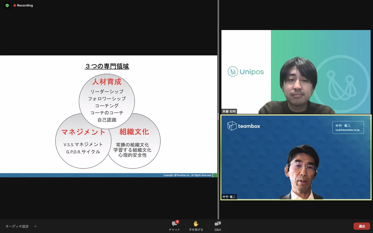 ・登壇:株式会社チームボックス 代表取締役 ラグビーフットボール協会 理事 中竹 竜二 氏、Fringe81株式会社 執行役員 兼 Uniposカンパニー社長 斉藤知明