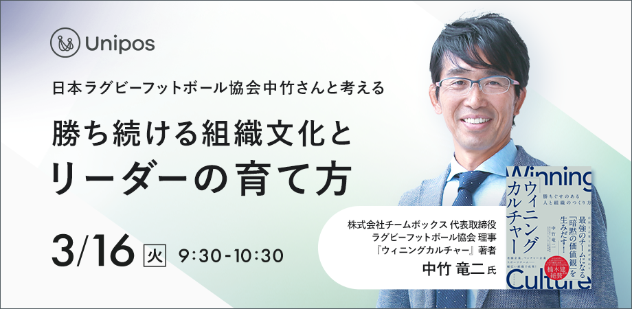 今回、3月16日にUniposウェビナー「日本ラグビーフットボール協会 中竹 竜二さんと考える 勝ち続ける組織文化とリーダーの育て方」を開催。中竹氏を講師にお迎えし、組織が勝ち続けるためのカルチャーづくりについてディスカッションをおこないました。
