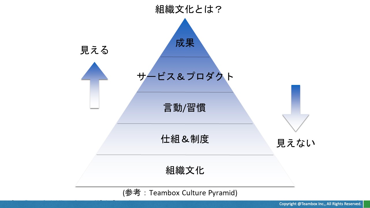 企業において「組織文化」は非常に見えにくいことが多いです。しかし、組織文化はプロダクトや制度、習慣、成果など企業を形づくるあらゆるものの土台になる重要な要素なのです。勝てる組織をつくるためには、この組織文化にメスを入れる必要があります。