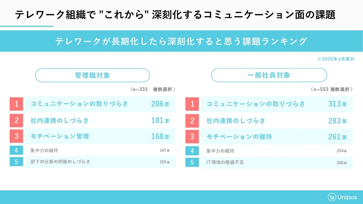 「テレワークが長期化したら深刻化すると思う課題」について、管理職・一般社員のどちらも「コミュニケーションのとりづらさ」や「社内連携のしづらさ」が上位に挙がっていることを紹介。