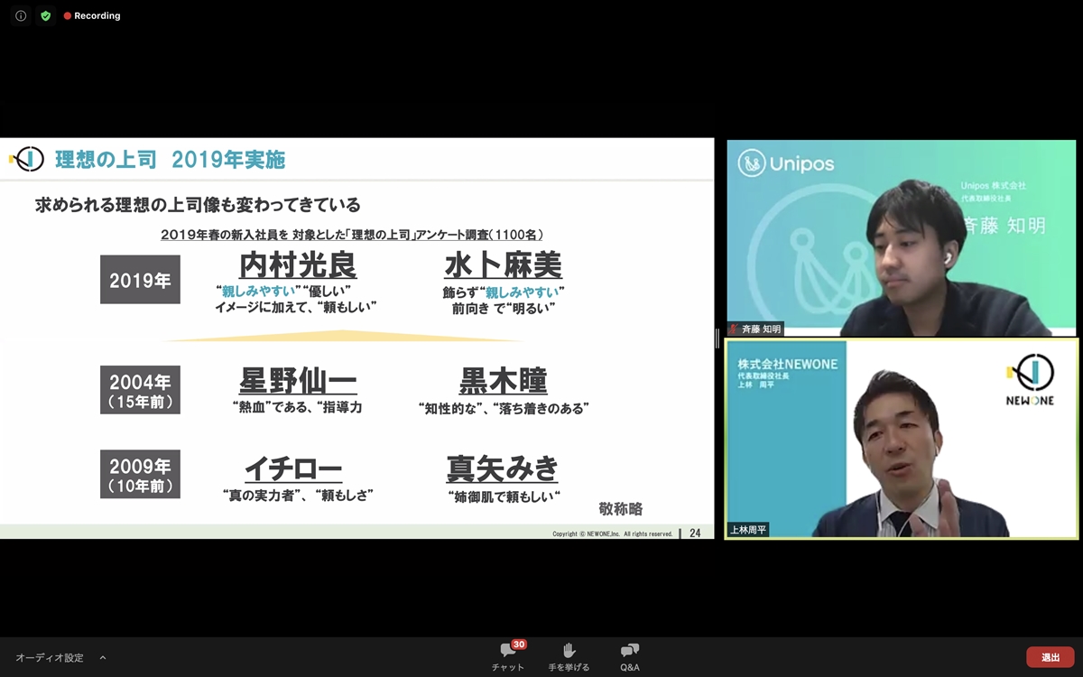 ウェビナーの冒頭、斉藤は2020年5月に管理職・一般社員を対象におこなったアンケートの結果を公開し、