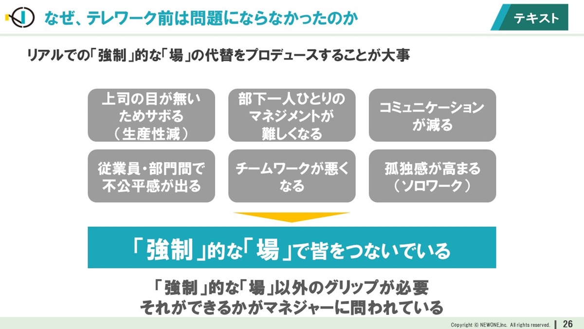 こうした懸念点がテレワーク以前は表面化しなかった点について、上林氏は「強制的に管理する場として職場が機能していた」からだと分析。その上で、テレワークが前提となるこれからの時代は「管理職は強制力ではなく、それ以外の方法でメンバーをグリップする必要がある」と指摘しました。